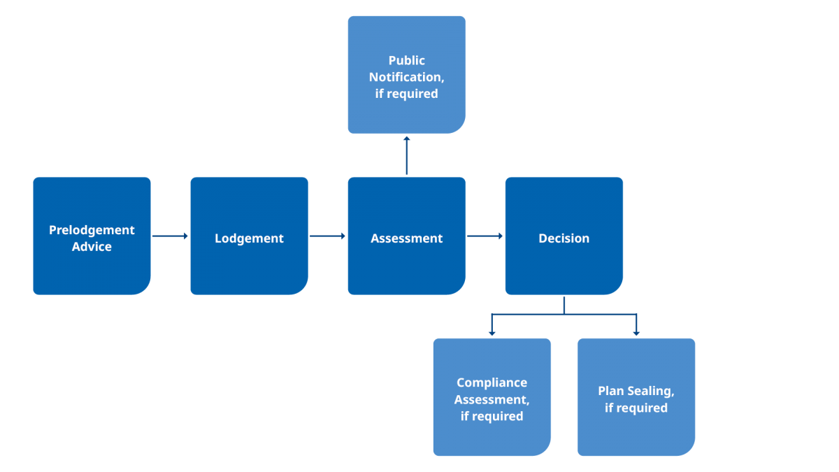 Development applications typically follow a multi-step process in accordance with the Economic Development Act 2012 (ED Act). Some may be optional, such as prelodgement advice. Other steps may only apply in specific circumstances, such as public notification (notice of application).